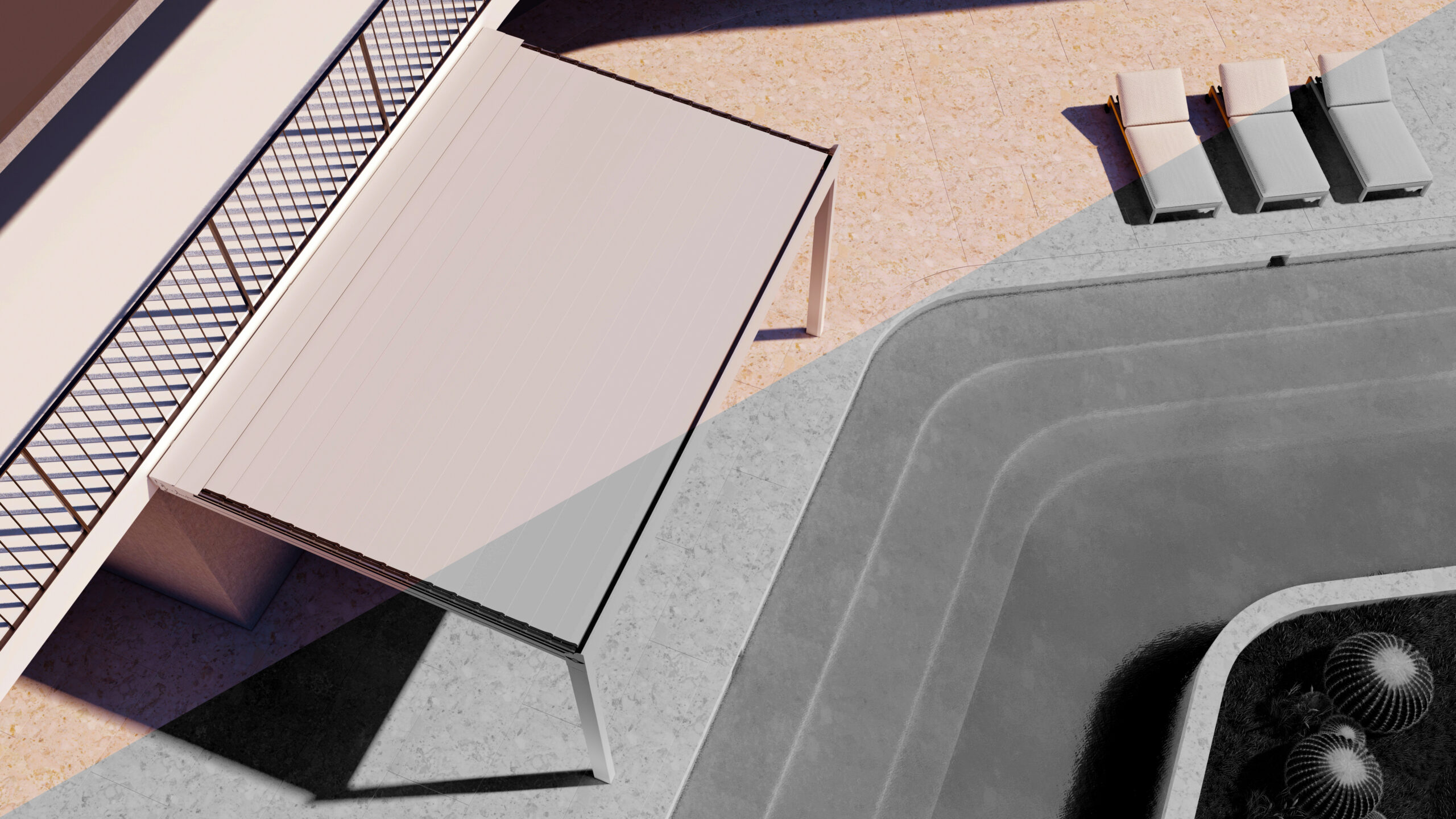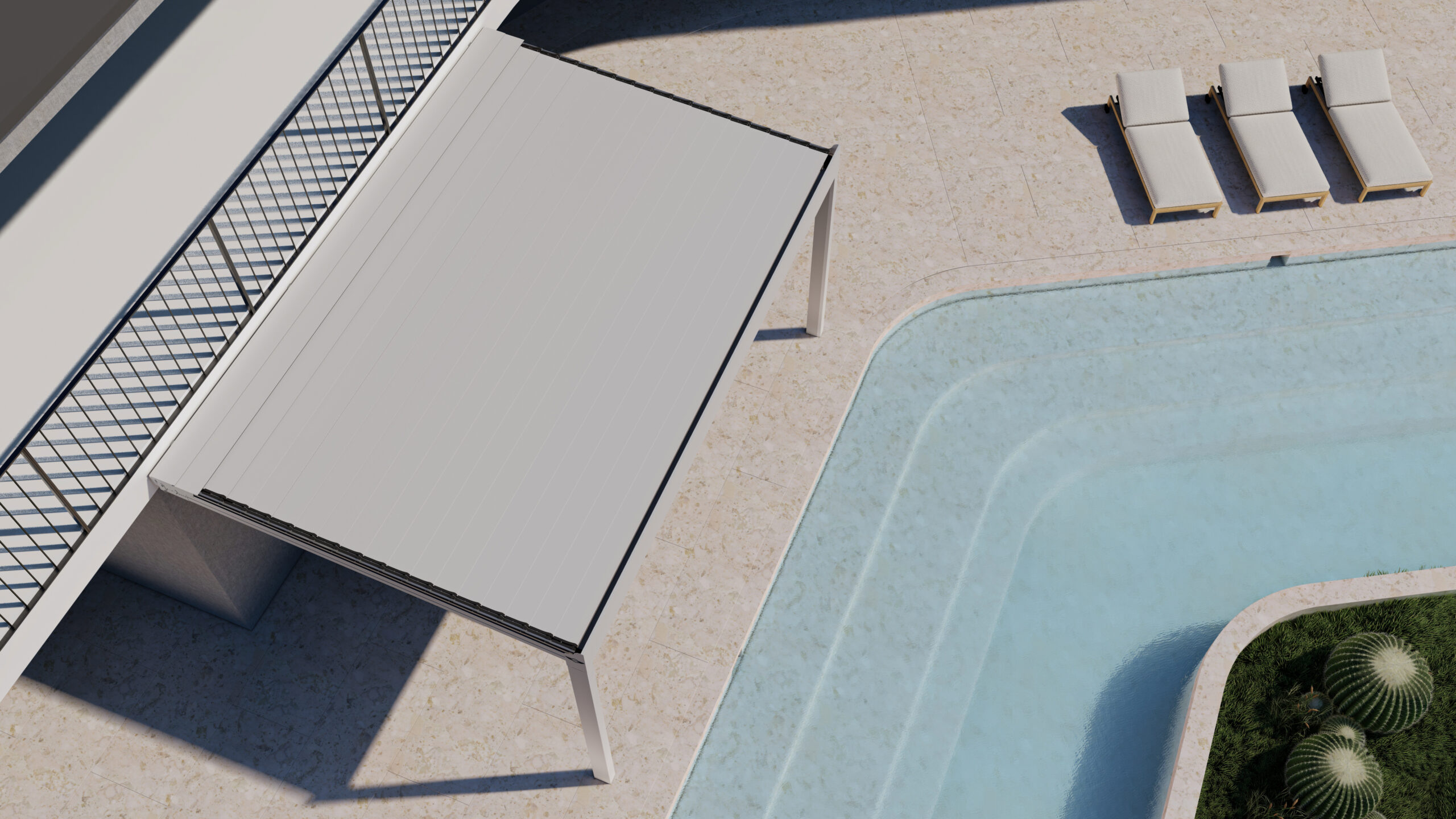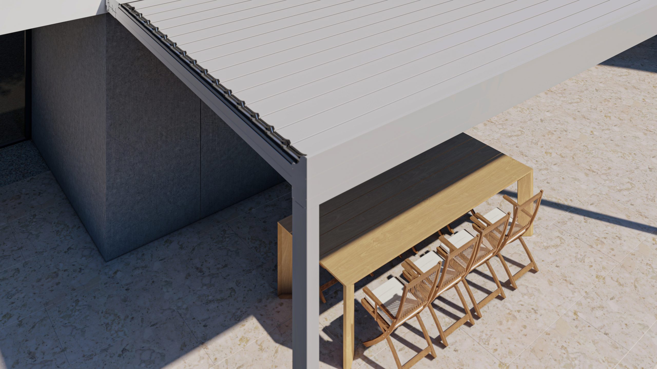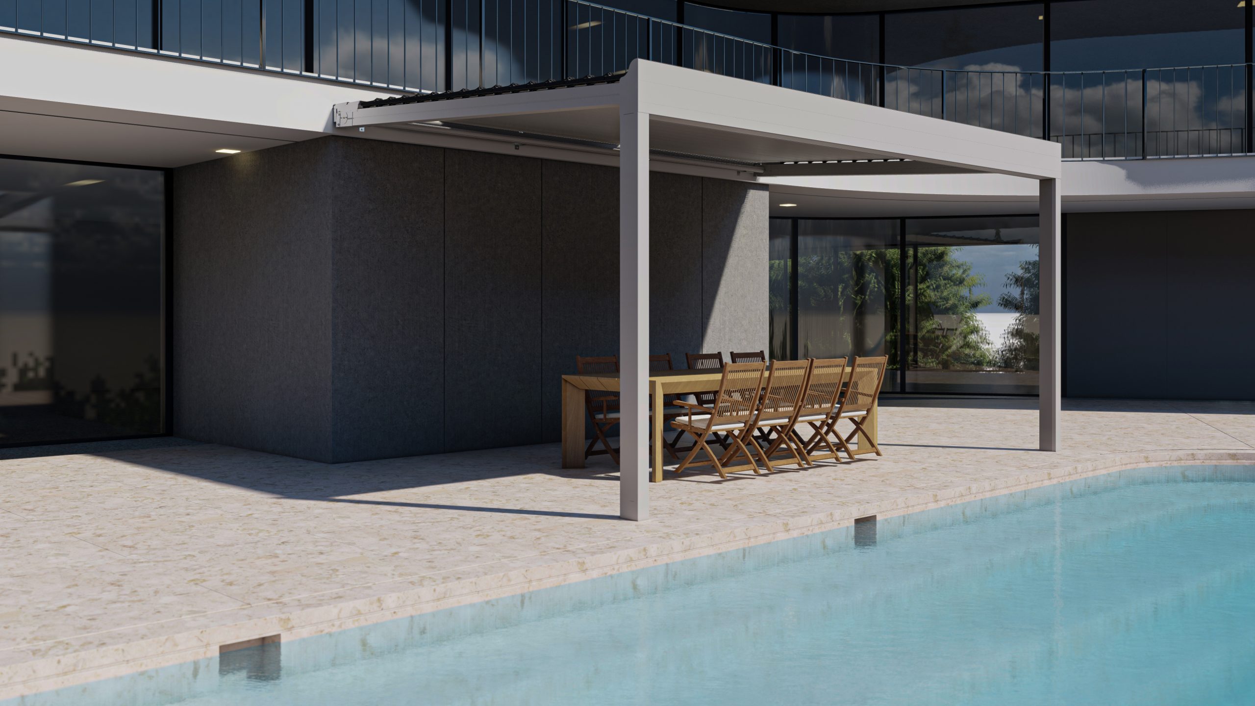 The louvres on the pergola ceiling open and close on demand, giving you precise control over sunlight, wind, rain, and temperature at any time of day.