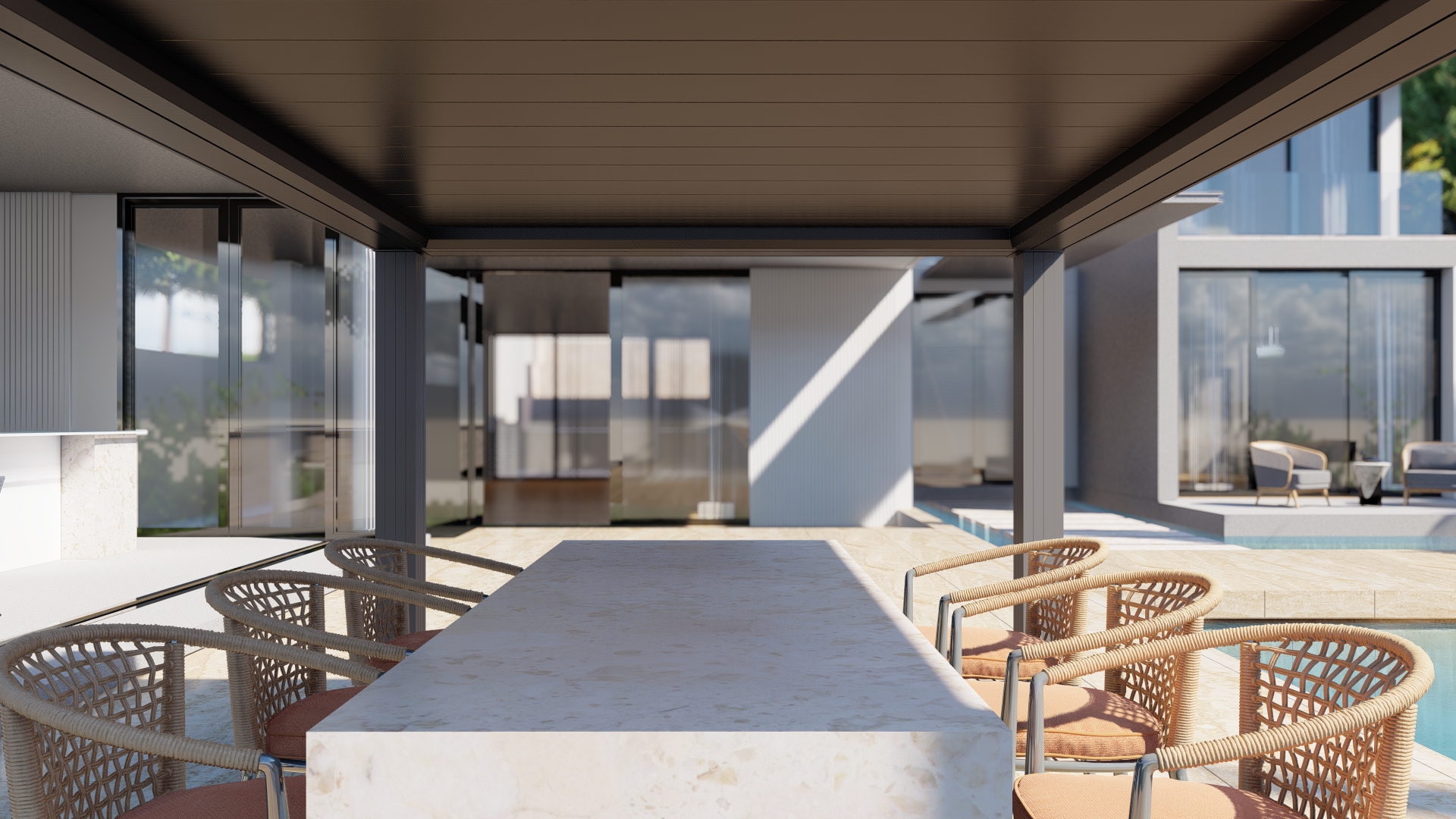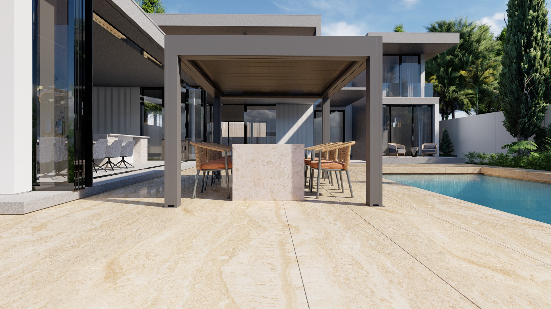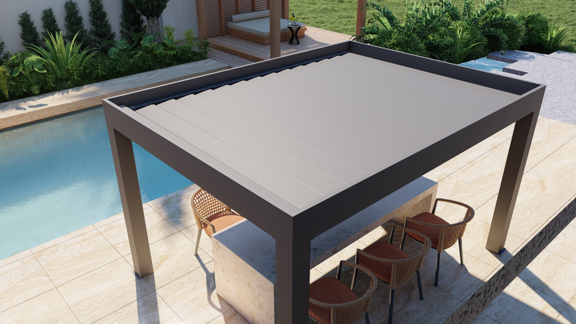 The louvres on the pergola ceiling open and close on demand, giving you precise control over sunlight, wind, rain, and temperature at any time of day.